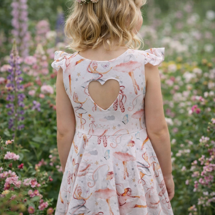 På ryggen skjuler det seg en nydelig detalj: et hjerteformet utsnitt som gjør kjolen ekstra unik og sjarmerende. Den myke og elastiske bomullsblandingen gir maksimal komfort, slik at barnet kan bruke kjolen til både lek og fest.
