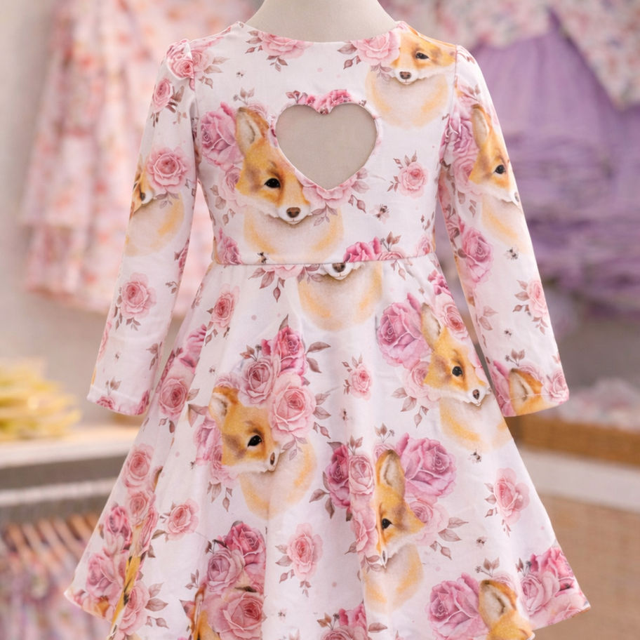 På ryggen skjuler det seg en nydelig detalj: et hjerteformet utsnitt som gjør kjolen ekstra unik og sjarmerende. Den myke og elastiske bomullsblandingen gir maksimal komfort, slik at barnet kan bruke kjolen til både lek og fest.